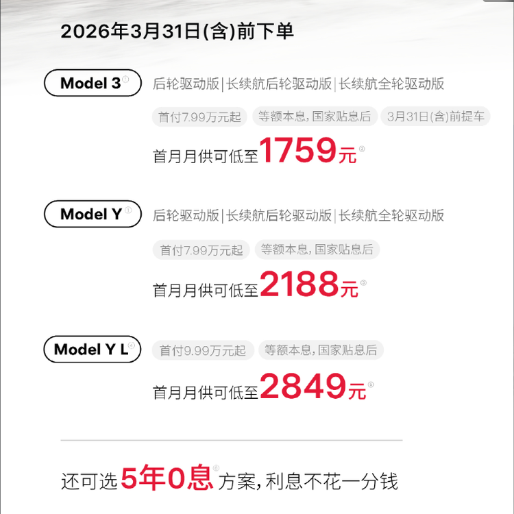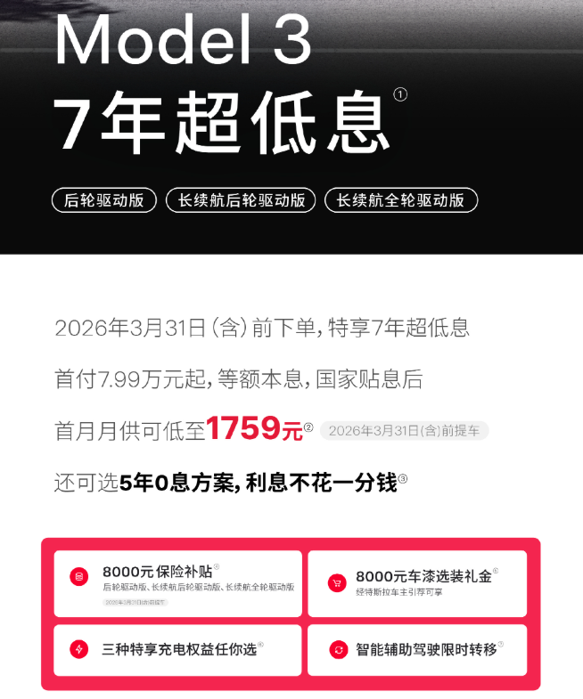 根据官方信息,活动有效期至3月31日(含),Model 3首付7.99万元起,7年月供低至1759元;Model Y首付7.99万元起,月供低至2188元;Model Y L首付9.99万元起,月供低至2849元。此外,Model 3的指定版本可享8000元限时保险补贴,可与优惠政策叠加使用。