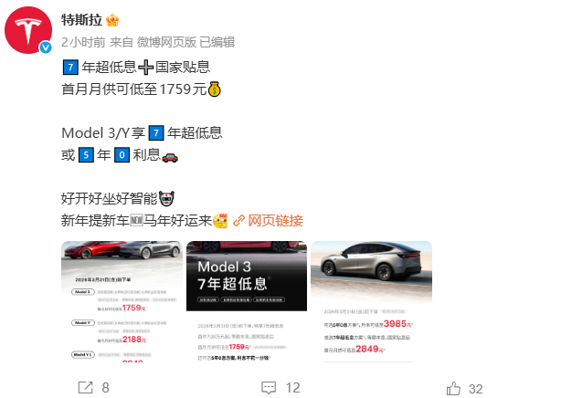 车家号·0浏览·2026-02-26 10:44 · 北京2026年2月26日,特斯拉中国推出限时购车优惠政策,面向Model 3、Model Y、 Model Y L(参数|询价)主力车型提供5年0息与7年超低息双重金融方案,同步叠加保险补贴后,进一步降低购车门槛。