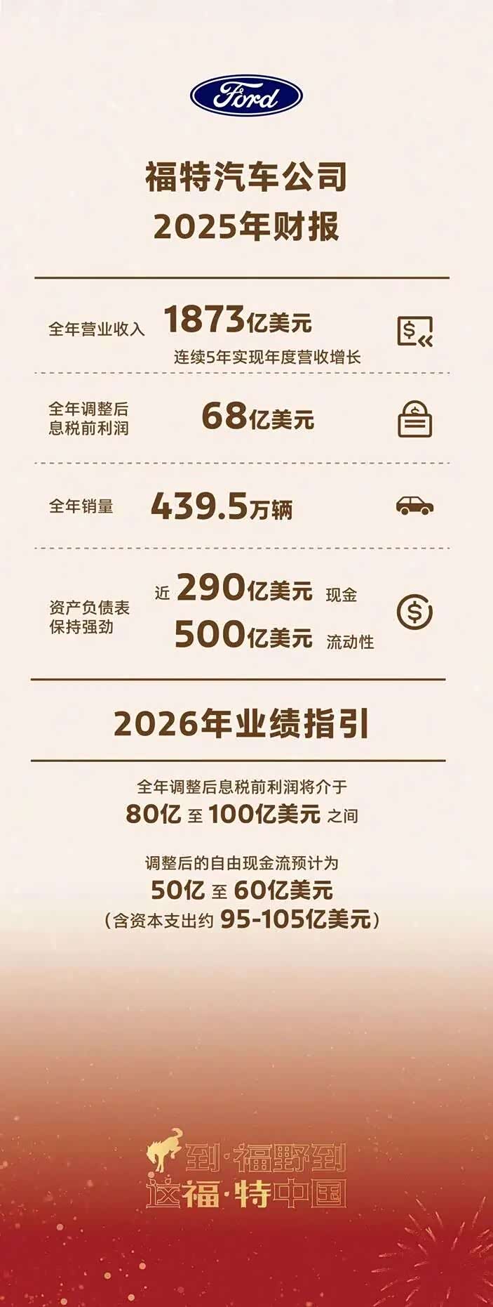 福特汽车2025年全年财报:营收1873亿美元,同比增长1%,实现连续五年年营收增长;净亏损82亿美元,和2024年相比转盈为亏,但调整后息税前利润68亿美元;现金近290亿美元。
