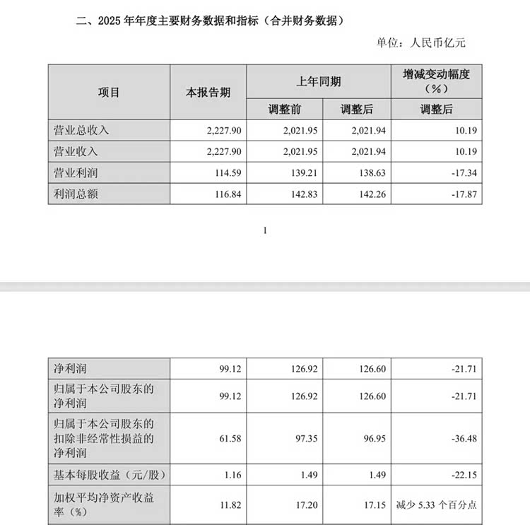 长城汽车2025年业绩快报:营收2227.9亿元,同比增长10.19%;营业利润114.59亿元,同比下降17.34%;净利润99.12亿元,同比下滑21.71%。