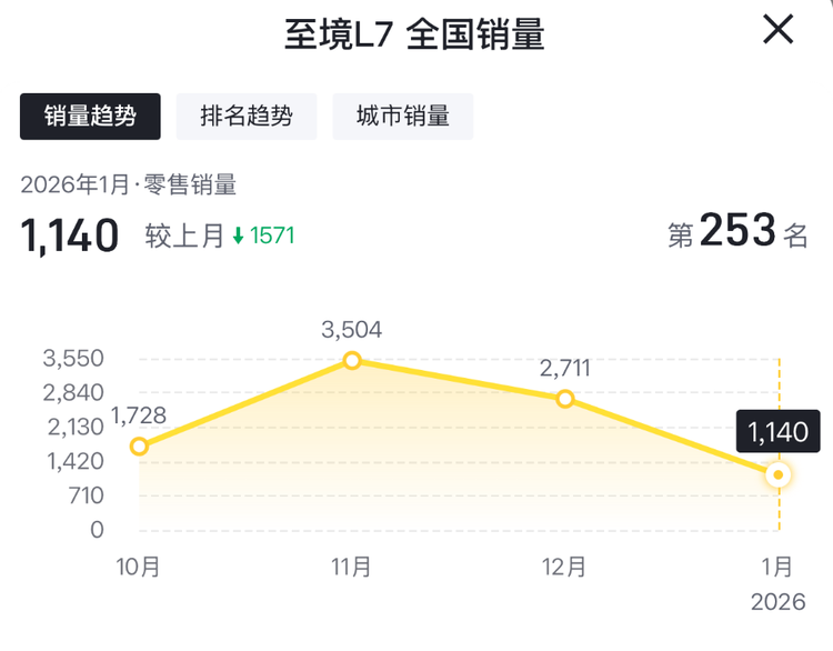 这意味着,从2025年12月份开始,截止到2026年1月份,至境L7的单月零售销量已经接连2个月下滑了。