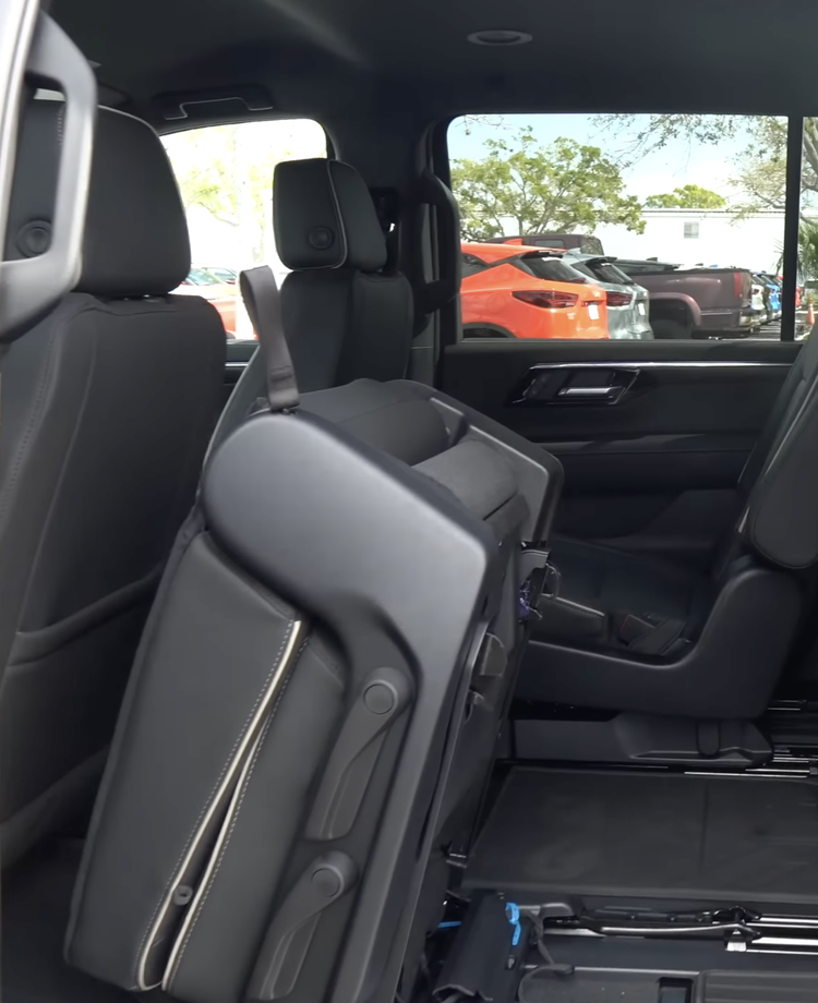 Suburban的第二排座椅不但像普通座椅一样可以前后移动和调节靠背俯仰,还可以通过一个扳手将靠背一键折叠,此时再拉动一个拉带,就能将整个座椅向前翻转,此时形成一个巨大的开口供人进出第三排。同时,在二三排都不坐人的情况下,这里还可以容纳一些较高的大件物品。