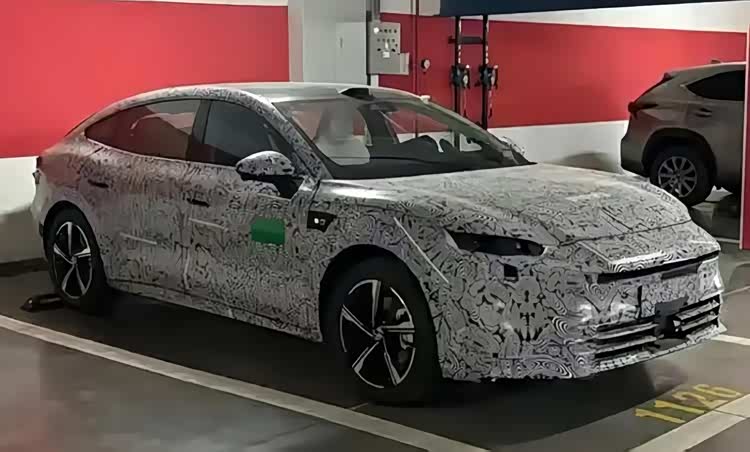 车顶前部可见一颗突出的激光雷达装置,表明该车将搭载高阶智能驾驶辅助系统,是区别于现款燃油轿跑的核心特征之一。
