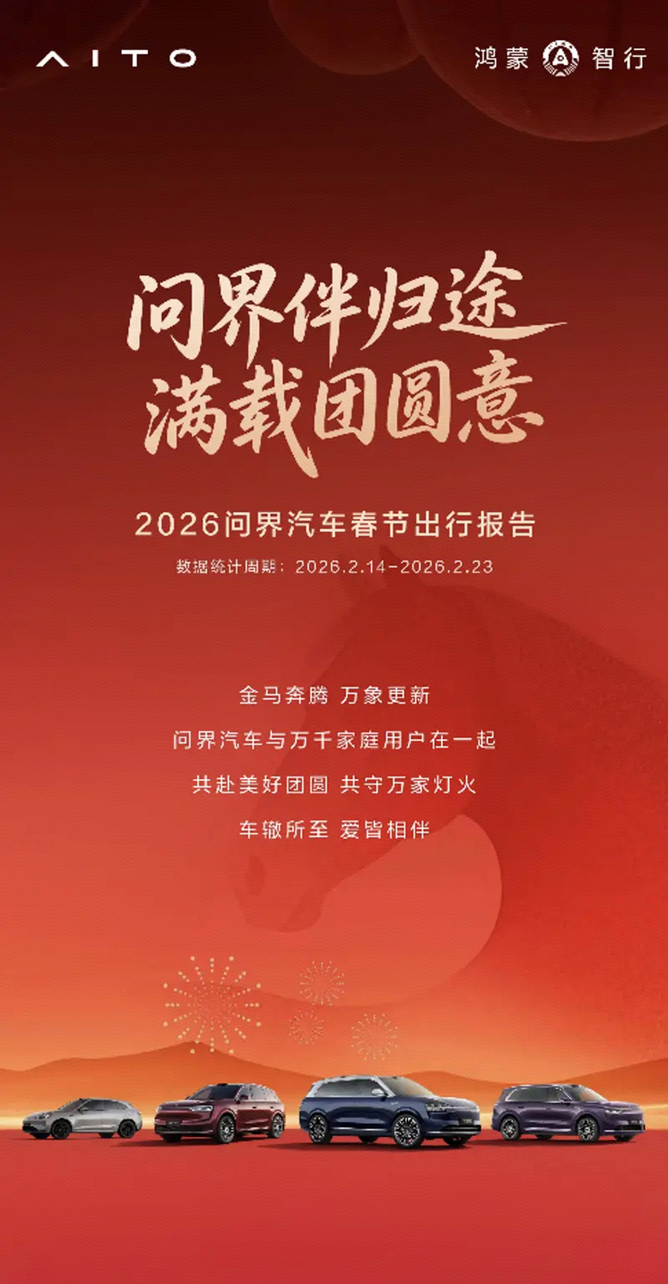 问界汽车发布《2026问界汽车春节出行报告》,以用户真实行驶数据呈现春节期间的出行状态。统计周期内,问界车主累计行驶里程达到8.2亿公里,折算相当于绕地球20460圈。从使用结构来看,增程系统贡献里程3.8亿公里,较日常提升17.6%。