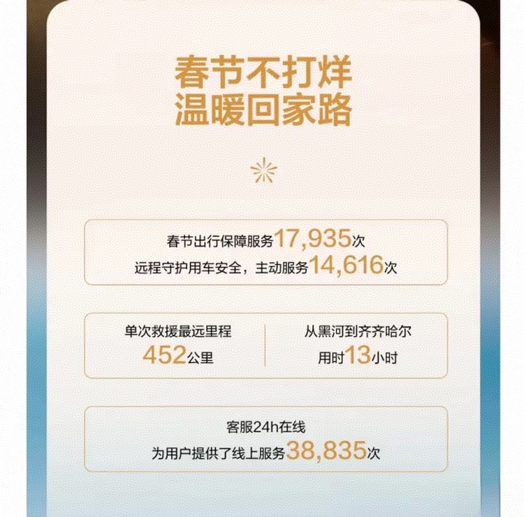 春节期间救援网络覆盖能力得到验证。单次救援最远里程达到452公里,从黑河至齐齐哈尔用时13小时。跨区域协同依托直营网点与合作服务网络实现资源调度。长距离救援对拖车资源、人员调配与路况评估提出要求。在东北冬季低温环境下,电池性能与道路条件对救援效率产生影响。该案例体现出服务体系在极端距离条件下的组织能力。对于跨省返乡用户而言,服务网络的覆盖范围成为购车决策的重要因素之一。