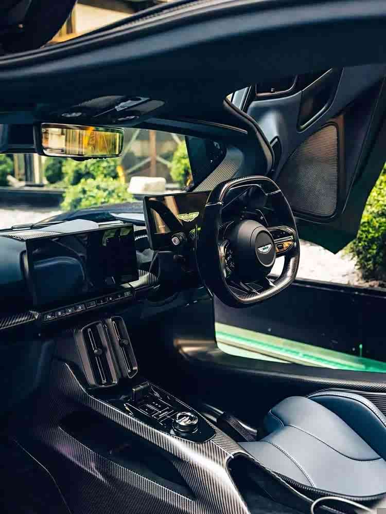 Gordon Ramsay这辆 Valhalla 外观为 Chimera Blue 车色,并选配多处碳纤维套件与蓝色点缀;内饰采碳纤维座椅与蓝色皮革包复,并配有 Bowers & Wilkins 音响系统。影片与照片中也可见,他抵达目的地后一度花时间摸索「双斜角上掀式车门」把手位置,显示仍在熟悉新车操作。