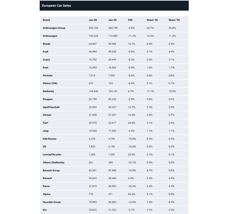 车家号·0浏览·2026-02-26 14:36 · 上海进入2026年,欧洲的新车市场在开局就迎来了不利局面。根据欧洲汽车制造商协会的数据显示,1月整个欧洲地区的新车注册量为961382辆,同比下滑3.5%。