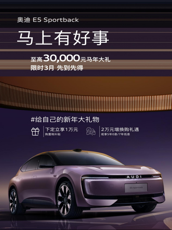 而上汽旗下的上汽奥迪也有动作,奥迪E5 Sportback推出了价值3万元的购车权益,3月31日前下订奥迪E5 Sportback不仅能享受1万元购置税补贴,同时还能在“2万元增换购礼遇”和“5年0息/7年低息”两项权益中二选一。