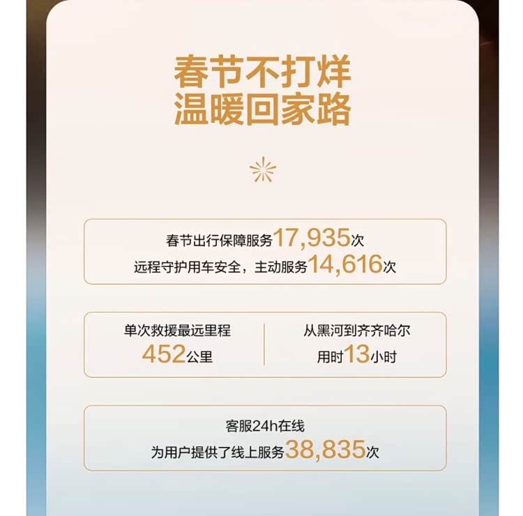 春节期间,问界共提供出行保障服务17,935次;远程守护用车安全,主动服务14,616次,将许多潜在故障消弭于无形。客服中心24小时在线,为用户提供了线上服务38,835次。为保障用户在遭遇紧急情况时能获得及时且高效的援助,问界服务网络展现了强大的跨区域协同能力,单次救援最远里程452公里,从黑河到齐齐哈尔用时13小时,树立了新豪华服务标杆。