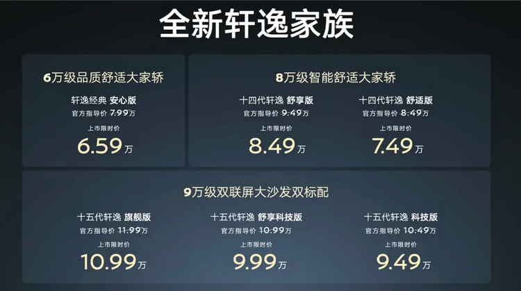 先从销量最高、价格最亲民的轩逸说起,限时价9.49-10.99万元,先别急的说贵,因为下面还有14代轩逸和经典轩逸在售,三代同堂任君选择,并且十五代轩逸在配置层面还是轩逸史上最强的一代车型。
