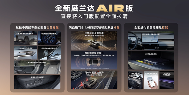看到这,有些朋友肯定会质疑了,合资车的最低配谁买得下手?按以往来说确实如此,但威兰达AIR版是个例外,主驾驶10向电调、皮质座椅、满血版TSS 4.0驾驶辅助、14英寸屏幕+智能车机、50W无线充电、氛围灯、手机数字钥匙,通通给你标配了。这些曾经在丰田中配车型上都不敢奢望的配置,如今全系标配,老车主们不知道会不会馋哭了。所以按照广汽丰田的话术来形容就是:起步即高配。