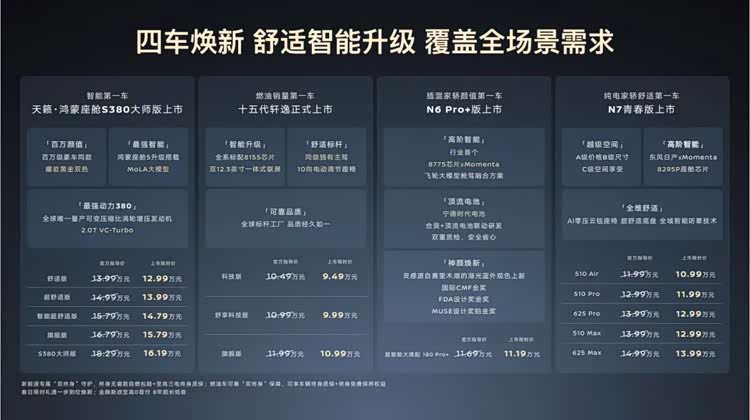 你方唱罢我登场,下午轮到了东风日产发布新车,而且一口气就是4款,包含了十五代轩逸、天籁·鸿蒙座舱S380大师版、N6 180 Pro+、N7青春版,每台车的价格和配置都有不同的惊喜。