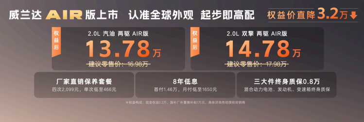 除了价格和配置层面的诚意,广汽丰田还推出了全新威兰达AIR版的厂家直销保养套餐、8年低息、三大件终身质保0.8万元升级政策。每一项其实都是为了给用户省钱,特别是三大件终身质保升级政策,如果买双擎版本的话一定要加上,对于打算长期持有的用户,一块动力电池的维修更换就足以回本。