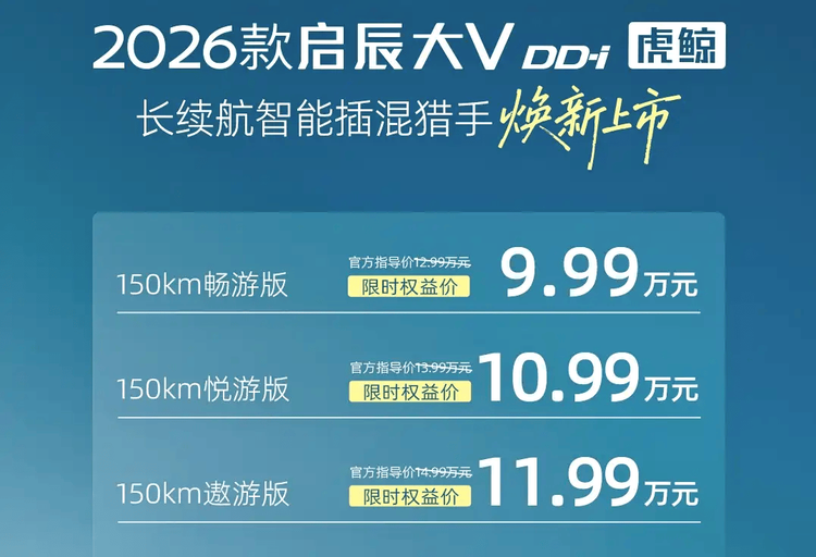车家号·0浏览·2026-02-26 15:30 · 山西1月13日,编辑从官方获悉,2026款启辰大V DD-i虎鲸正式上市,共推出3款车型,售价区间为12.99-14.99万元,官方同时推出限时权益价9.99-11.99万元。新车整体内外设计没有太多改变,主要针对车辆的配置、续航、补能、油耗等方面进行了优化升级。