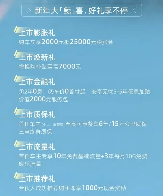即日起下定,并于2026年2月28日(含)前完成交车,即可享受上市权益价,还有首任车主(个人、非营运)至高整车6年/15万公里质保,三电终身质保,零利息和低利息金融方案等多项权益在内的好礼。