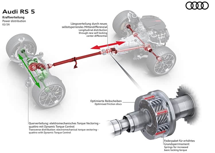 当然,全新奥迪RS 5依然是有quattro系统,还配备了新的中央差速器,减轻弯道推头现象。这套名为动态扭矩控制系统,是一种机电式扭矩矢量分配后桥差速器,能在毫秒间调整后轮之间的扭矩分配。