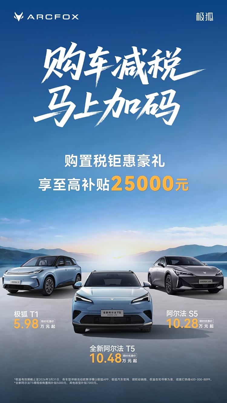 新年伊始,极狐汽车率先推出“购置税兜底豪礼”至高补贴25000元,用真金白银为新能源购置税政策调整后缓解成本压力。除了购置税补贴,还包括:购车消费券、终身免费保养(部分车型),从购车到用车形成全生命周期保障。覆盖车型包括:极狐阿尔法T5、阿尔法S5以及极狐T1,主力车型同步参与,覆盖从5万级通勤车,到10万级家庭SUV细分市场。