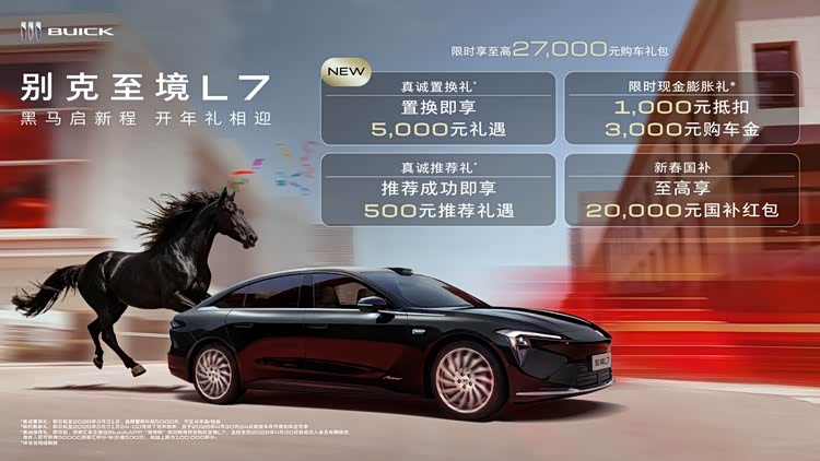 作为一款上市不久新车,别克至境L7开启“黑马启新程开年礼相迎”限时钜惠活动,购车权益覆盖定金膨胀、置换补贴、国补叠加与试驾礼遇,多重优惠降低入手门槛。此外,还推出针对新婚人群的专属权益:2026年2月内领证的夫妻,下定别克全系车型并完成核销开票,可获10000元随礼抵扣金。