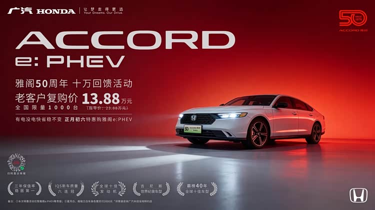 2月22日,为庆祝雅阁50周年,广汽本田推出“十万回馈”活动,雅阁e:PHEV迎来重磅促销政策老客户复购尊贵版仅需13.88万元,全国限量1000台。作为参考,该车型指导价为23.88万元**,此次活动相当于直降10万元,价格力度空前。考虑到非活动期间终端普遍优惠约5万元,所以这次官方的价格调整还是挺有诚意的,但注意的是13.88万元的“情怀价”一定要老客户复购才可享。