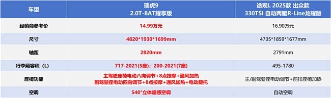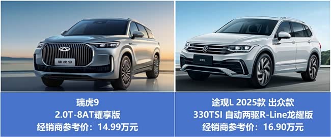 春节假期热闹非凡,接待客人、走亲访友之后,总该带全家人来一场说走就走的放松之旅。那么,对于中国家庭而言,谁才是春节全家出游的“真香”之选呢?接下来,我们就以瑞虎9 2.0T-8AT耀享版(以下简称“瑞虎9”)和途观L 2025款出众款330TSI自动两驱R-Line龙耀版(以下简称“途观L”)为例,看看谁的“幸福指数”更高。