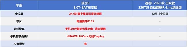 相比之下,途观L配有12英寸中控屏,支持语音交互、语音连续识别等功能。不过,其并未搭载主流高算力芯片,也不支持AI交互及手机50W智能无线充电+遗忘提醒功能,如果想用它智能“带娃”,或是获得更贴心的娱乐体验,还是稍显不足。