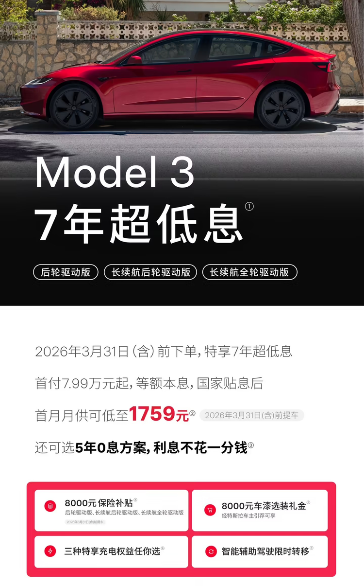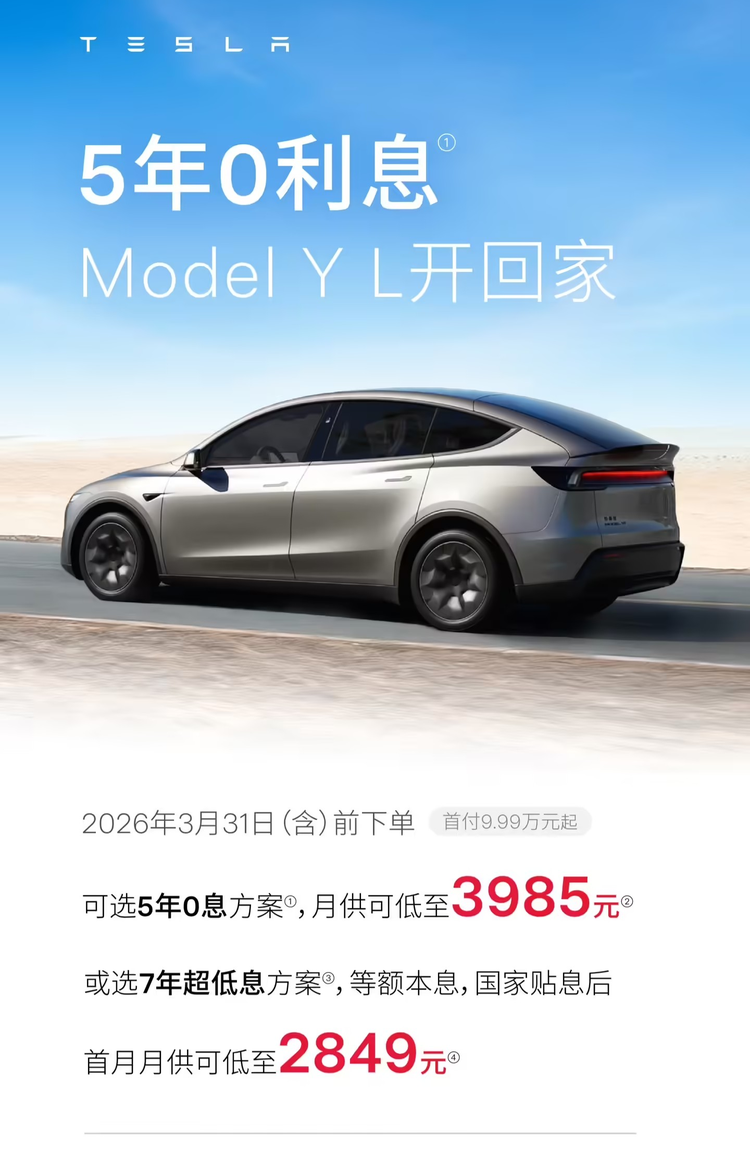 车家号·0浏览·2026-02-26 16:48 · 北京2 月 26 日,特斯拉中国又放出一个新消息:3 月 31 日(含)之前下单,可以走 7 年超低息贷款方案。