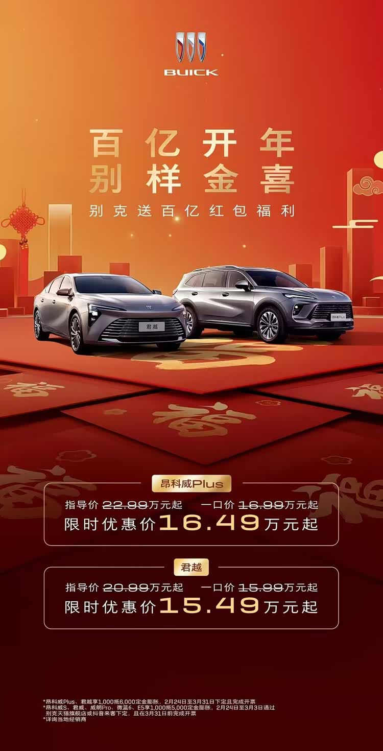 车家号·0浏览·2026-02-26 17:58 · 广东2月26日,上汽通用别克品牌旗下多款车型更新了购车优惠政策,其中在3月31日前(含)下定别克君越与别克 昂科威Plus(参数|询价)且完成开票,可享1000元抵6000元定金膨胀。叠加该权益后,别克君越的限时优惠价为15.49万元起,别克昂科威Plus限时优惠价为16.49万元起。