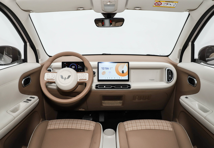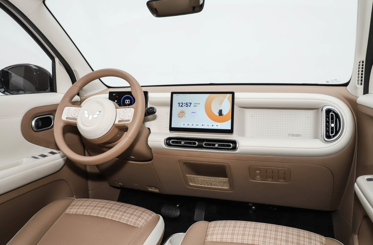 内饰的变化同样焕然一新,中控台采用胶囊形撞色风格,两侧为半圆形空调出风口,副驾前方位置还进入掏空处理,配合下方挂钩、网兜,提升实用性。而点阵装饰+“MINIEV”标识,再配合全新撞色格纹座椅、镀铬饰件等,继续强调精致感。