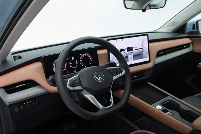座舱内的打造以"现代、实用、家居"为核心理念,将智能科技与舒适贴心的设计融入每一处细节,打造出年轻又考究的驾乘空间。智慧双屏交互成为座舱的核心亮点,12.9英寸中控屏拥有1920*1080的高清分辨率,屏幕表面镀有抗反射与防指纹涂层,既让正午强光下的导航路线清晰可见,又能保持屏幕洁净顺滑,德系抗冲击、抗振动认证更让屏幕在颠簸路段依旧稳定运行;10.25英寸仪表屏集成丰富功能,除显示通话、胎压等基础信息外,还支持地图投屏与AR实景导航,导航路线直接投射于实景路面,同时同步显示音乐相关信息,让驾驶视线无需频繁切换,行车更安心。
