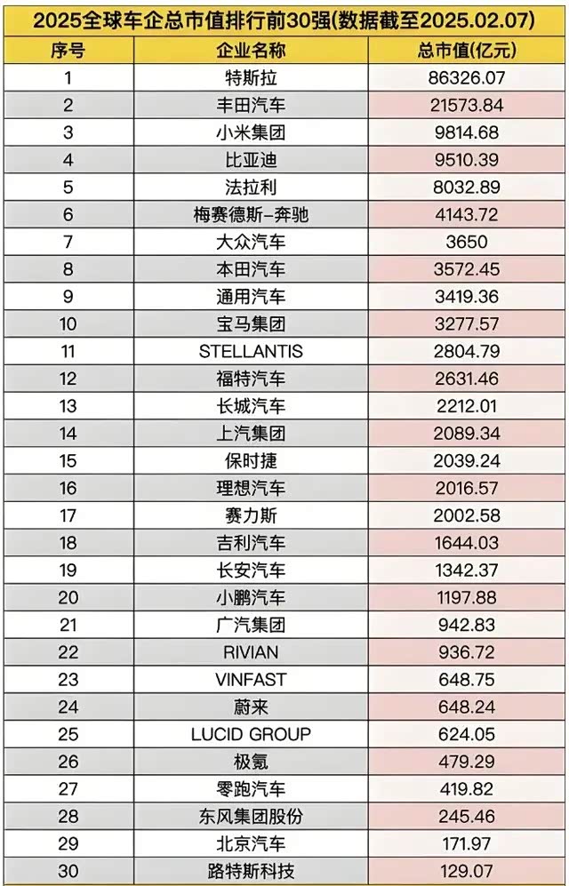 说到市值,汽车公司离百万亿美元更是遥遥无期,排名第一的特斯拉在2025年年初时约1.2万亿美元;排名第二的丰田汽车就只有3000亿美元;中国的小米、比亚迪在1300亿美元左右。