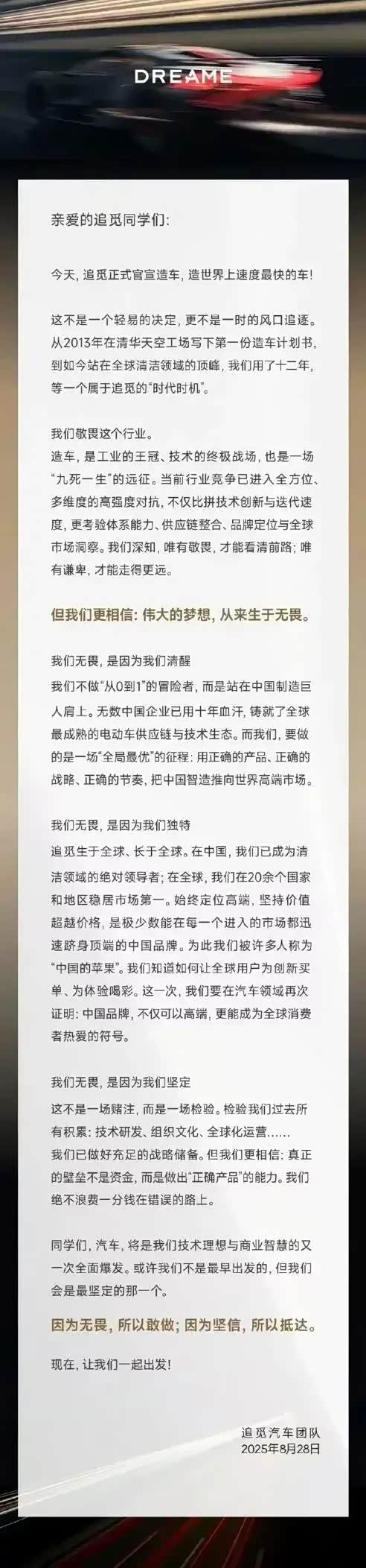早在去年8月,追觅科技发布公开信,宣布进军汽车领域,将打造“世界上速度最快的车”,俞浩最近还公开喊话华为的余承东来加盟。