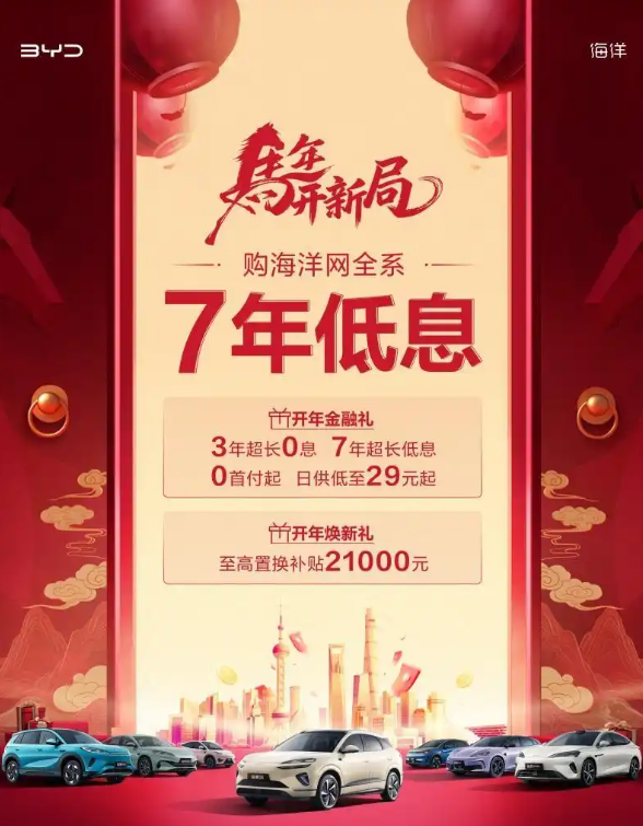 一天之前的2月25日,比亚迪海洋网宣布全系车型推出3年超长0息、7年超长低息等金融政策,日供低至29元起,也是成为又一家新加入“七年低息大军”的车企。24日,比亚迪旗下的个性品牌方程豹也同步发布7年超长贷的金融政策,适用 豹5(参数|询价)长续航版、钛7全系车型。