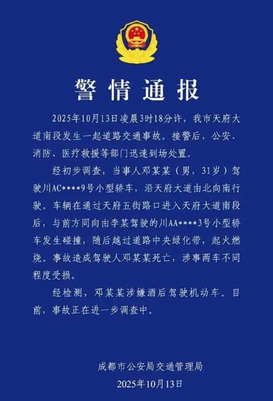 当天,成都公安发布的警情通报显示,当日凌晨3时许,成都天府大道南段发生一起道路交通事故,当事人邓某某(男,31岁)驾驶小型轿车,行驶过程中与前方同向由李某驾驶的小型轿车发生碰撞,随后越过道路中央绿化带,起火燃烧;事故造成邓某某死亡,经检测,其涉嫌酒后驾驶。