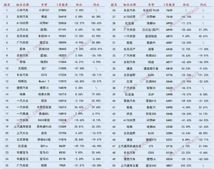 从头部阵营来看, 小米YU7(参数|询价)以37865辆的销量登顶,环比仅微降2.4%,成为榜单最大黑马,也印证了科技跨界玩家在SUV市场的穿透力。吉利博越以26410辆紧随其后,同比暴涨66.38%,凭借换代升级与性价比优势,在传统SUV市场站稳脚跟。AITO问界M7以25026辆位列第三,同比增长185.62%,华为赋能的智能化体验与产品迭代,成为其核心增长引擎。