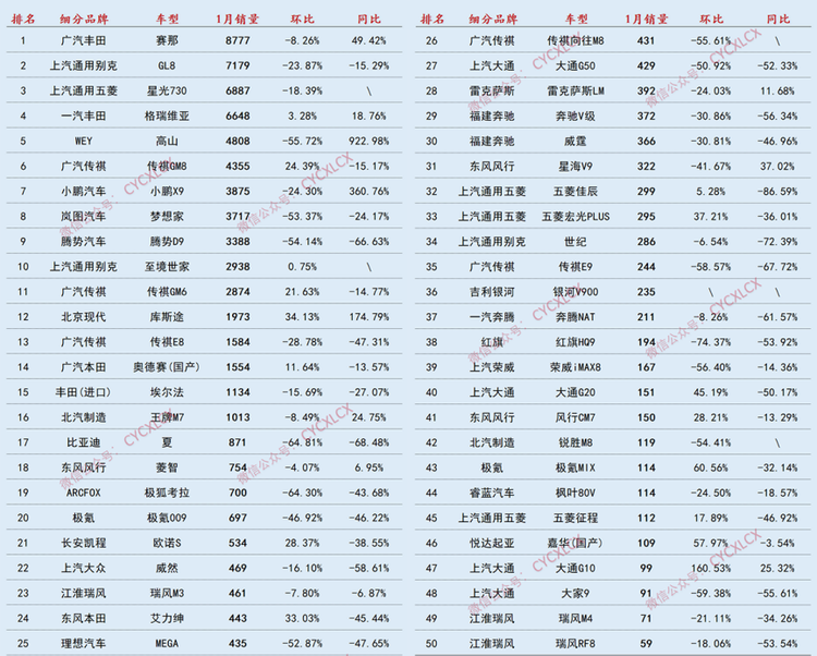 与之形成鲜明对比的是,腾势D9、传祺E8等前排新能源MPV环比暴跌,年底集中交付透支了1月需求,成为高端新能源MPV淡季承压的核心原因。
