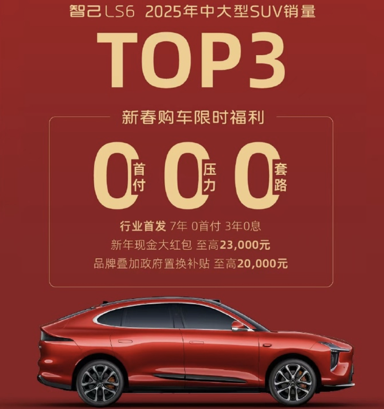 智己汽车也在同一天推出“7年0首付”、“3年0息”的金融方案,叠加新年现金红包至高2.3万元,新一代智己LS6限时售价19.49万元起。