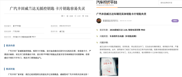 2026款威兰达于2025年11月底正式上市,从交车之初,钥匙失灵、易损坏、数字钥匙适配性差等问题就开始集中出现,如今在各大汽车投诉平台,相关投诉内容随处可见。此外,车主们还表示,购车前广汽丰田的官方宣传视频中,从未提及车辆配备的是卡片钥匙且无常规遥控钥匙,部分车主购车前向销售确认机械钥匙相关问题时,也未得到销售关于“仅配备无遥控功能的迷你应急机械钥匙”的明确说明,直至提车才发现实际配置与预期不符,这也让车主们觉得自身的知情权未得到保障。