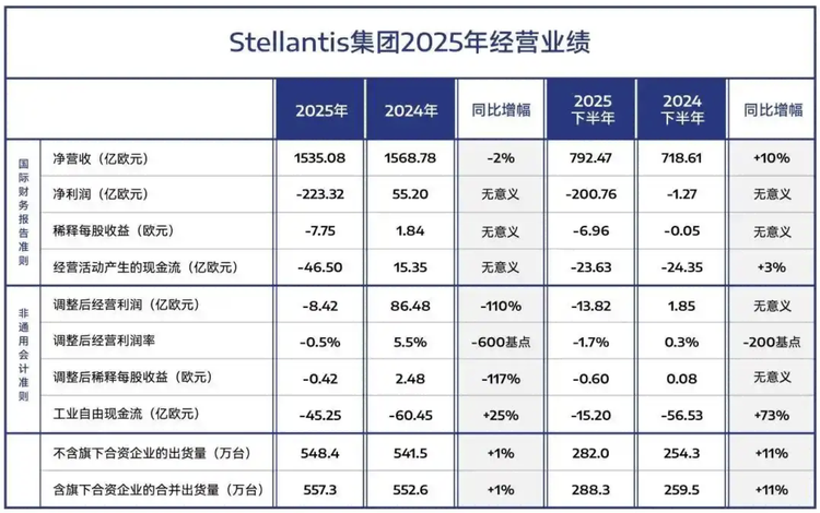 从销量数据看,Stellantis的表现并不算差。财报显示,集团2025年全年售出548万辆汽车,比2024年增加约7万辆,位居全球第四。净收入1535亿欧元,仅同比下降2%。