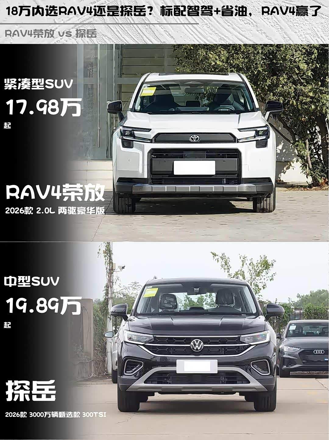 最近在选家用SUV的朋友看过来!👀 纠结 RAV4荣放(参数|询价)2026款2.0L两驱豪华版和探岳2026款3000万辆甄选款300TSI的我,深度试驾后掏心窝子分享对比干货👇
