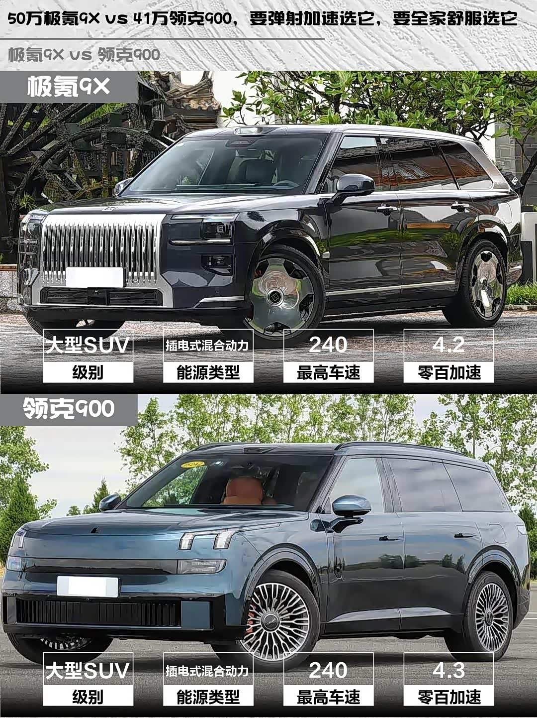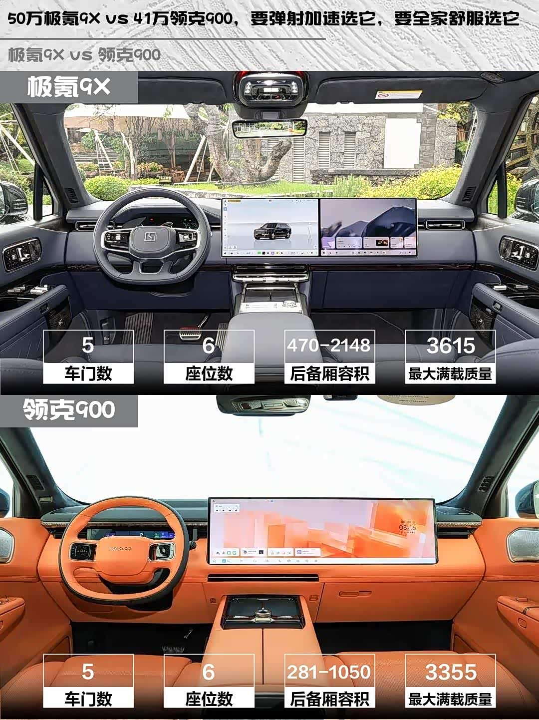 要性能炸裂+豪华质感选极氪9X,要家用灵活+性价比选领克900。我个人更倾向极氪9X,毕竟50万就能享受百万级的加速和内饰,你们会怎么选?