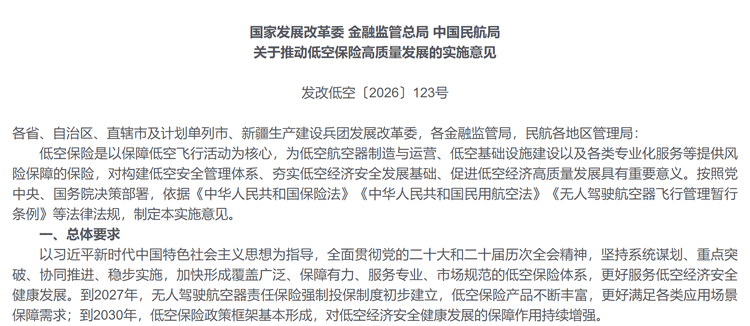 为破解这一发展瓶颈,国家发展改革委、金融监管总局、中国民航局近日联合发布《关于推动低空保险高质量发展的实施意见》(以下简称《意见》),明确提出到2027年初步建立无人驾驶航空器责任保险强制投保制度,到2030年基本形成低空保险政策框架。