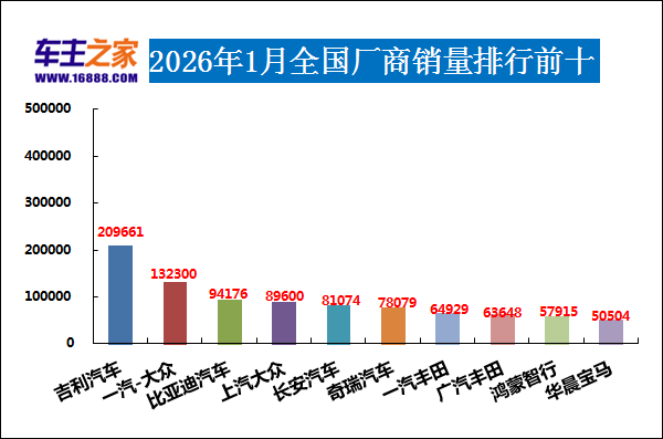 1月吉利汽车销量领衔,进入十万辆阵营的还有一汽-大众。南北丰田齐齐上榜,BBA中则是华晨宝马在列。