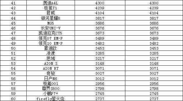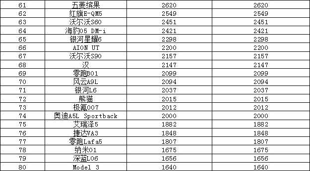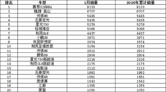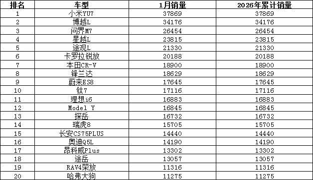 2026年1月汽车销量排行榜 小米YU7销量领先