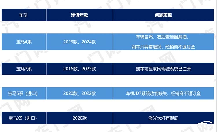 从涉诉车型的具体投诉问题来看,宝马中国旗下多款车型在不同年款中均存在车主投诉。其中,宝马4系是问题最多的车型,车辆自燃、右后差速器漏油、刹车片异常磨损、经销商不退订金等均是车主投诉的重点问题。整体来看,这些车型存在的问题既涉及车辆安全与品质,也包含经销商服务不规范的情况。