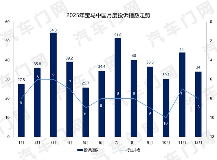 从月度走势来看,宝马中国单月投诉指数均控制在60以内,整体表现相对平稳。但即便投诉指数波动不大,其在行业投诉排名中仍长期稳居前十,投诉体量与行业关注度依然较高。