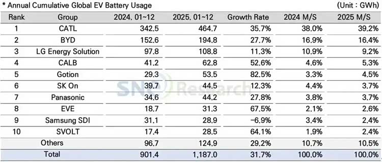 比如,动力电池领域,根据韩国研究机构SNE Research及动力电池应用分会的统计数据,2025年全球动力电池装车量约1187 GWh,同比增长31.7%。其中,六家中国企业(宁德时代、比亚迪、中创新航、国轩高科、亿纬锂能、蜂巢能源)合计市占率达到70.4%,首次突破七成,远超60%的基准线。