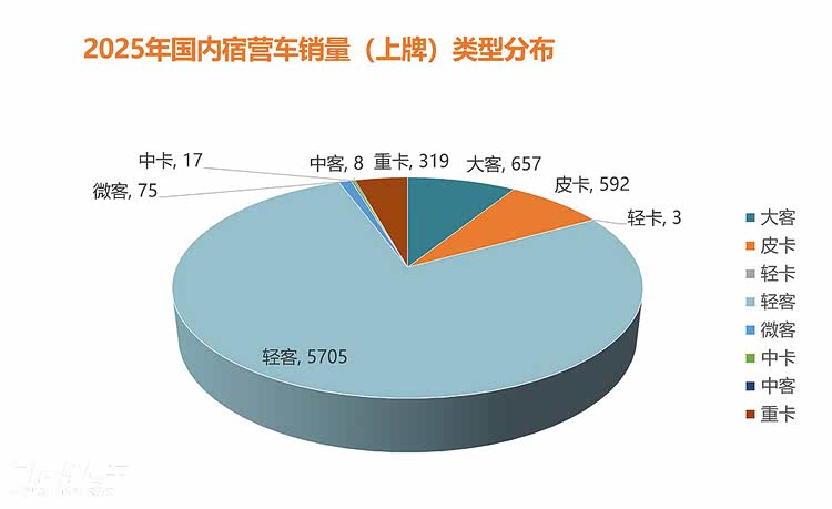 2025年的国内房车市场,另一个突出的格局改变就是宿营车领域,2025年国内宿营车销量达到7376辆,同比2024年(3974辆)增长85.61%。数据背后是三个方面的驱动,首先是旅居车产品申报政策的挤压(内高1750mm要求)驱动,其次是消费降级下的用户市场(性价比驱动),同时国内轻客和VAN类平台驾控方面的提升等方面,共同推动了国内宿营车品类的爆发,对于重卡类大型宿营车而言,准驾政策的优势也是其申请宿营车品牌公告的原因之一,不管怎样,未来国内房车市场在旅居车、宿营车以及各种政策红利期内的轻客平台,都将是国内房车市场的温床,起到重要的推动作用。