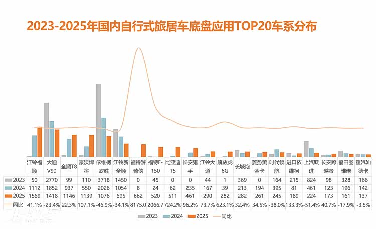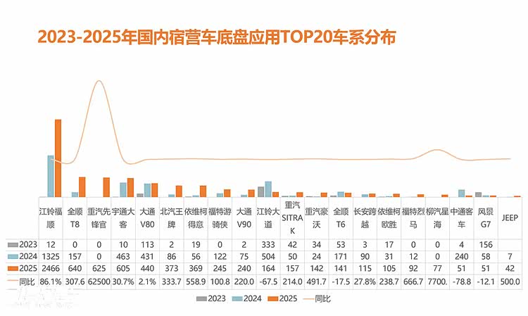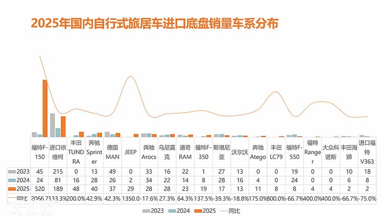 在进口底盘应用方面,福特F150等进口皮卡底盘,通过政策红利“变身”(乘用车路权),获得大量用户的青睐;其次是进口依维柯NewDaily,通过降级普惠用户市场,较2024年也有较大幅度增长。作为高端用户首选的奔驰系列房车,在国内用户圈层也较为稳定,在2025年持续稳定输出 。抛开政策影响下的进口底盘产品,国内高端进口底盘旅居车常年销量较为稳定,随着圈层的扩展影响,预测未来也将呈现多品类并驾齐驱的状态。