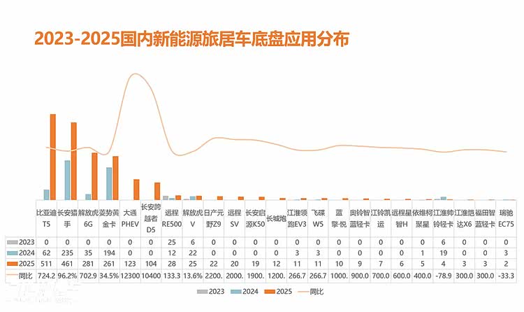 比亚迪T5作为同时具备驾控和空间优势的平台,成为新能源旅居车底盘销量冠军,长安猎手和菱势黄金卡则成为皮卡平台应用较多的底盘车系;与此同时,轻客家族的大通PHEV也逐渐发力,2025年取得不错的表现;据悉更多轻客平台将在未来布局新能源阵营,共同承接新能源旅居车市场。