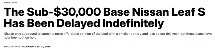 据猫头鹰车志了解,美国联邦电动车税收抵免政策于2025年秋季终止后,当地纯电汽车销量出现明显下滑,多家车企纷纷调整电动化策略。聆风作为全球首款量产纯电动轿车,此次入门版S版推迟上市,也折射出合资品牌在平价纯电市场的谨慎态度。